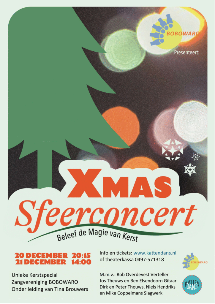 Op zaterdag 20 en zondag 21 december verzorgt Bobowaro een kerstoptreden in De Kattendans in Bergeijk. Het kerstverhaal in de moderne tijd. Dit jaar nemen we je mee op een bijzondere reis door het aloude kerstverhaal. Onze verteller zal het publiek begeleiden door de verschillende scènes, waarbij het koor de sfeer versterkt met een mix van kerstnummers. Daarnaast zijn er speciale gastoptredens van getalenteerde muzikanten, die samen met ons koor voor een onvergetelijke middag of avond zullen zorgen. Een perfecte gelegenheid om samen met familie en vrienden de kerstperiode in te luiden. Mis het niet!